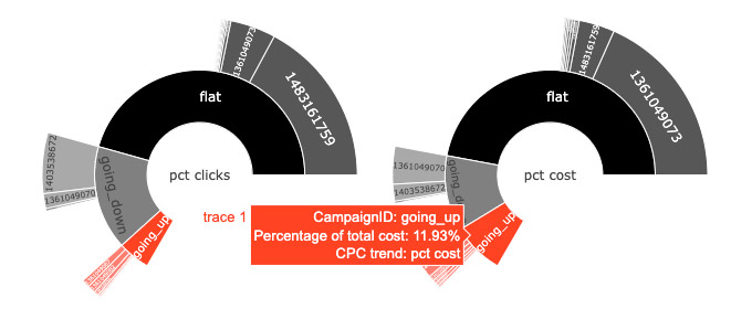 Here is the Sunburst Charts for Campaigns (w/ Clicks & Cost-share) clustered by CPC trends: