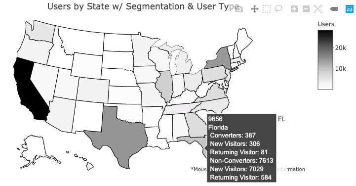 It can also be used to identify the most profitable area of marketing. From the data, it is clear that users mainly came from CA (16.4%) for this time period. This aligns with the special attributes of client’s services.