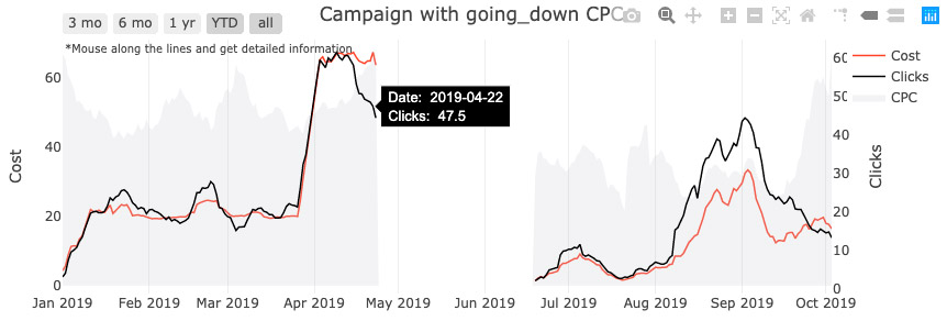 In order to compare the campaign performance, we have to look at campaign groups by CPC trends.