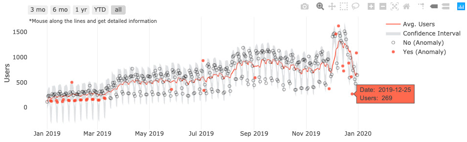 - For each anomaly point, we will break Users down to several segments to figure out which specific part has caused this positive/negative change. This can help with decision making in the next step. For example, in 2019-12-09, we had 1624 Users which was the maximum. After comparing that with the events tracker that has been placed on pages, we figured out that one of the blogs that we published received an overwhelming response on 2019-12-09, which also shows that Blogs can really be the driving force behind website traffic.